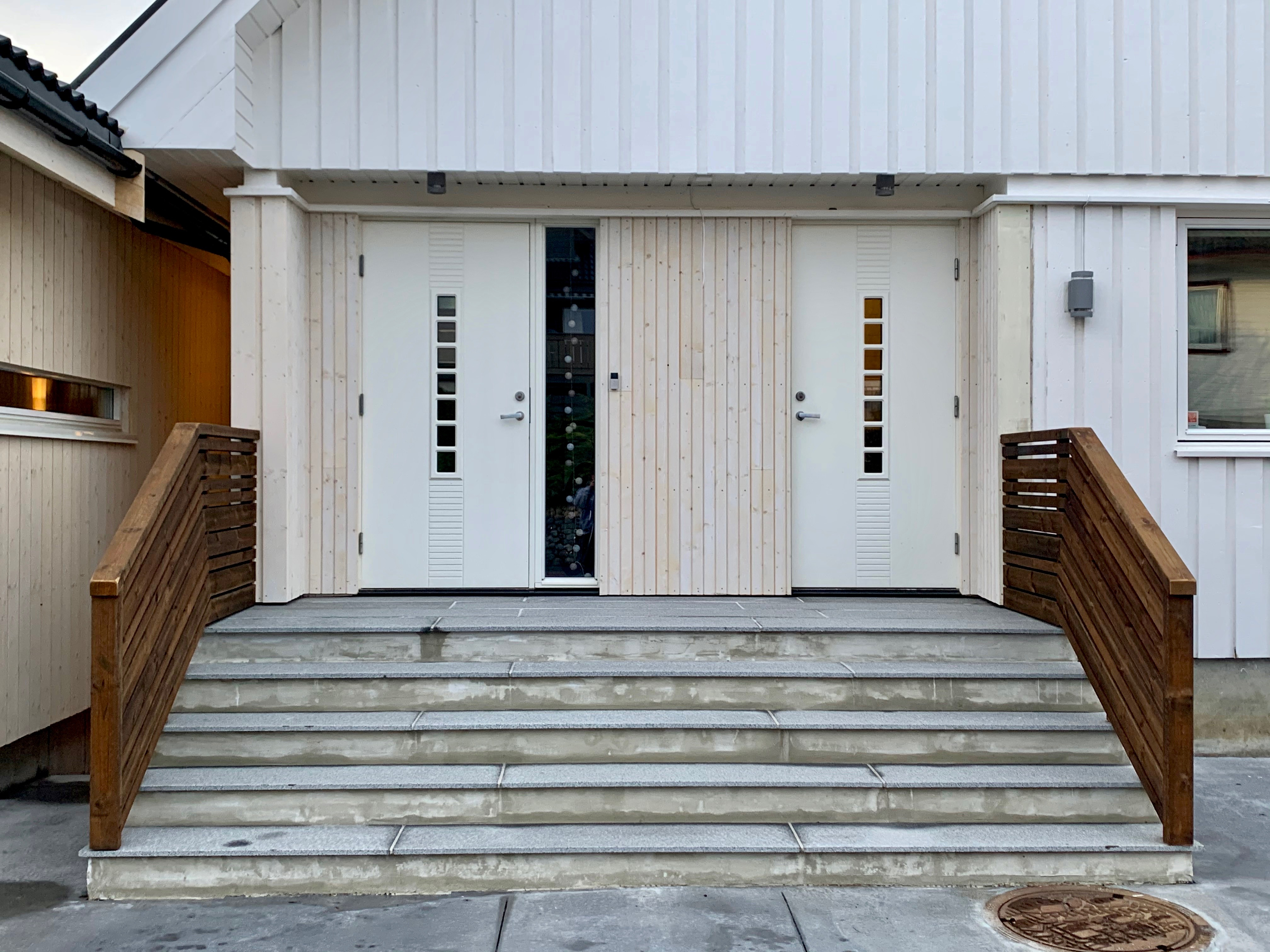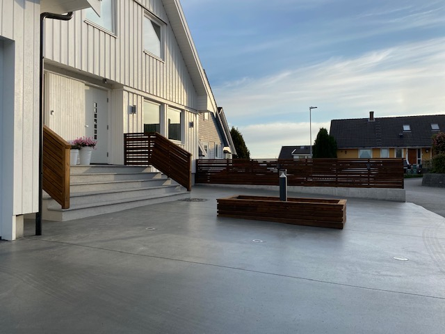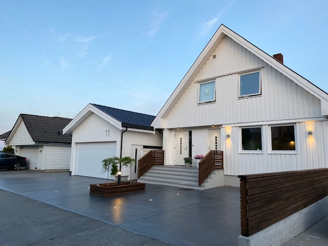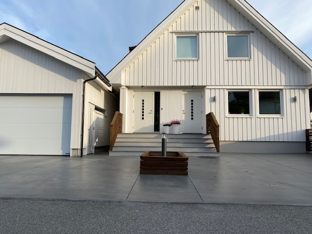 Ny garasje, inngangsparti og gjerder. Granitt på trappen og strukturbetong på bakken.